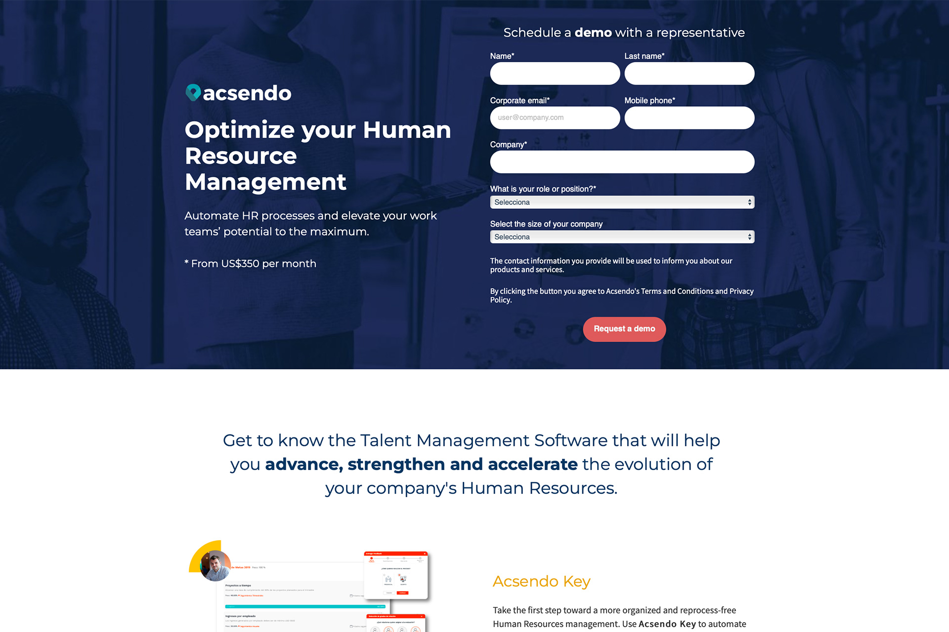 Acsendo is a startup that seeks to improve human talent management for medium and large companies by offering a SAAS product and a consulting service.